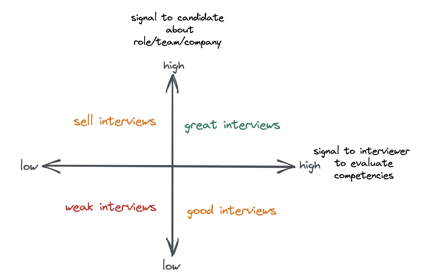 • Sell interviews may not yield a lot of signal to interviewers, but deliver a lot of signal to the candidate. These are necessary, but should be saved for later stages of the loop.
