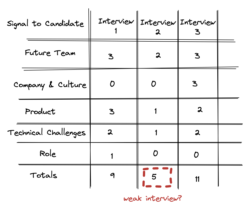 Another approach is to score each interview on signals that are important to candidates. Potential priorities like future team, company and culture, product, technical challenges, and role are important factors to consider for engineering interviews. This will help you identify weak interviews that need improvement.