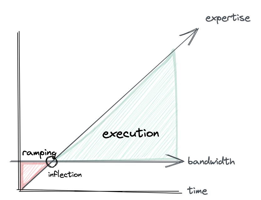 Although you’re capable of juggling everything, it’s draining. If you’re optimizing for long-term impact at your company, being a hero and thrashing is not a sustainable way to get there. Longer term, your expertise keeps growing, but your bandwidth stays constant.